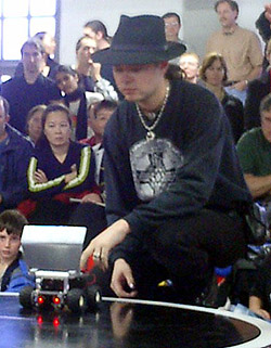 I didn't really expect him to do too well since he was built rather last minute with parts from Ziggy that I had lying around my workshop, but he took second place in the full-size category in the Robotics Society of America 2002 Holiday Robot Games and Expo, losing in the final to the reigning champion Beast. His advancement is even more surprising since I was having trouble with the sonar sensors and Zag kept seeing 'ghosts' that weren't there and was also losing his lock when he was tracking the opponent. I hope to have these problems fixed for his next competition. The sonar guided algorithm is designed to look for the opponent using twin sidewards facing sensors, turn towards it and then bear down on it using the forward facing sensors to target. My only real goal with this competition was to go up against Beast, which is Carlo Bertocchini's sumo bot and has been the reigning US champion since 1993. When Zag got to meet him in the final I was thrilled, but both the feeling and the match were short-lived as you will see below...